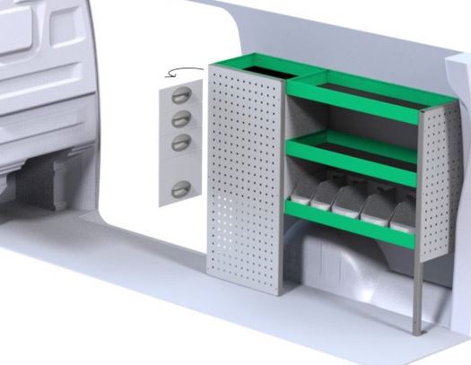 Liukuovesta taakse ulottuva hyllyratkaisu oikealle puolelle tavaratilaa, L2-korimalli. Käännettävissä 5-ovisiin autoihin vasemmalle puolelle. Valmistaja System Edström.
